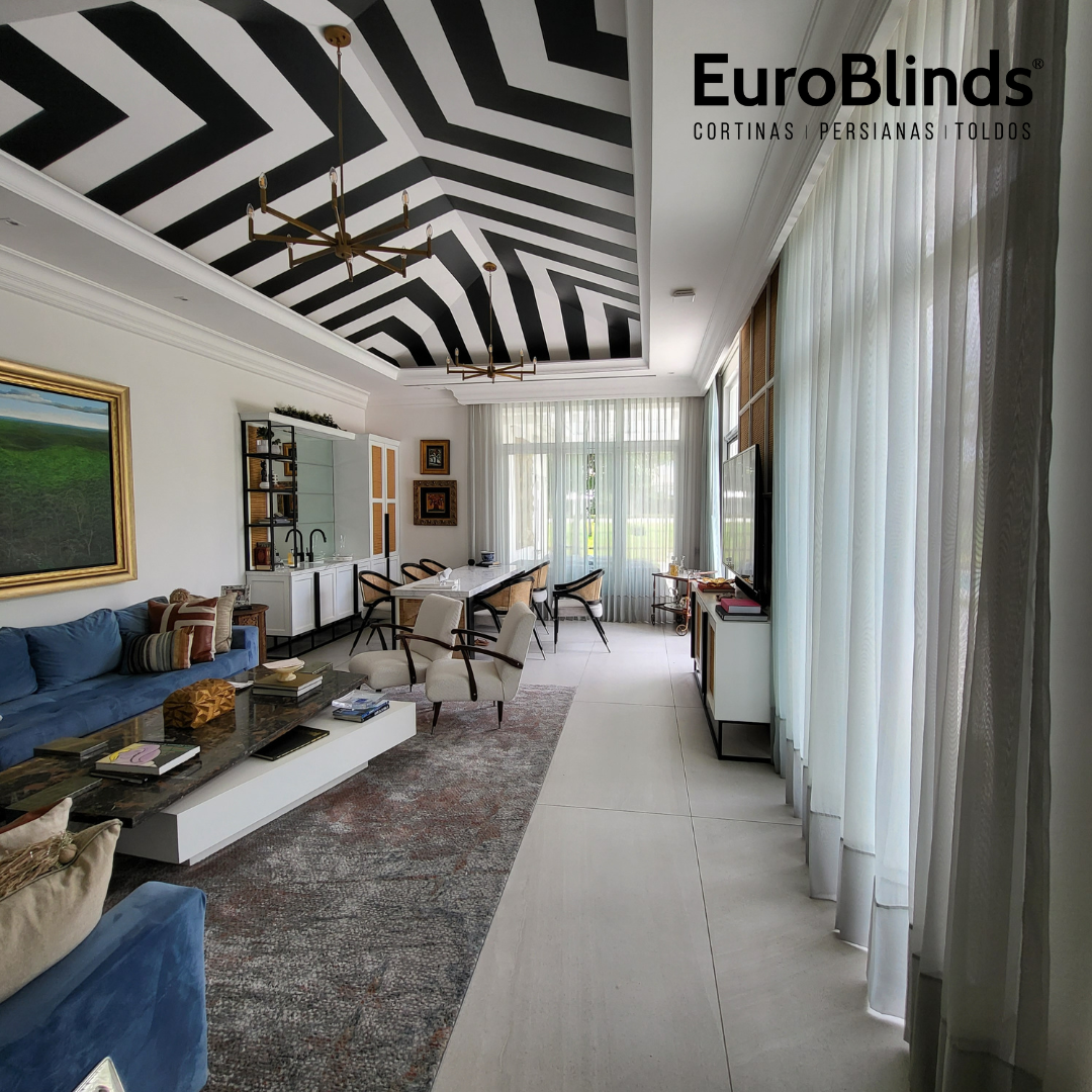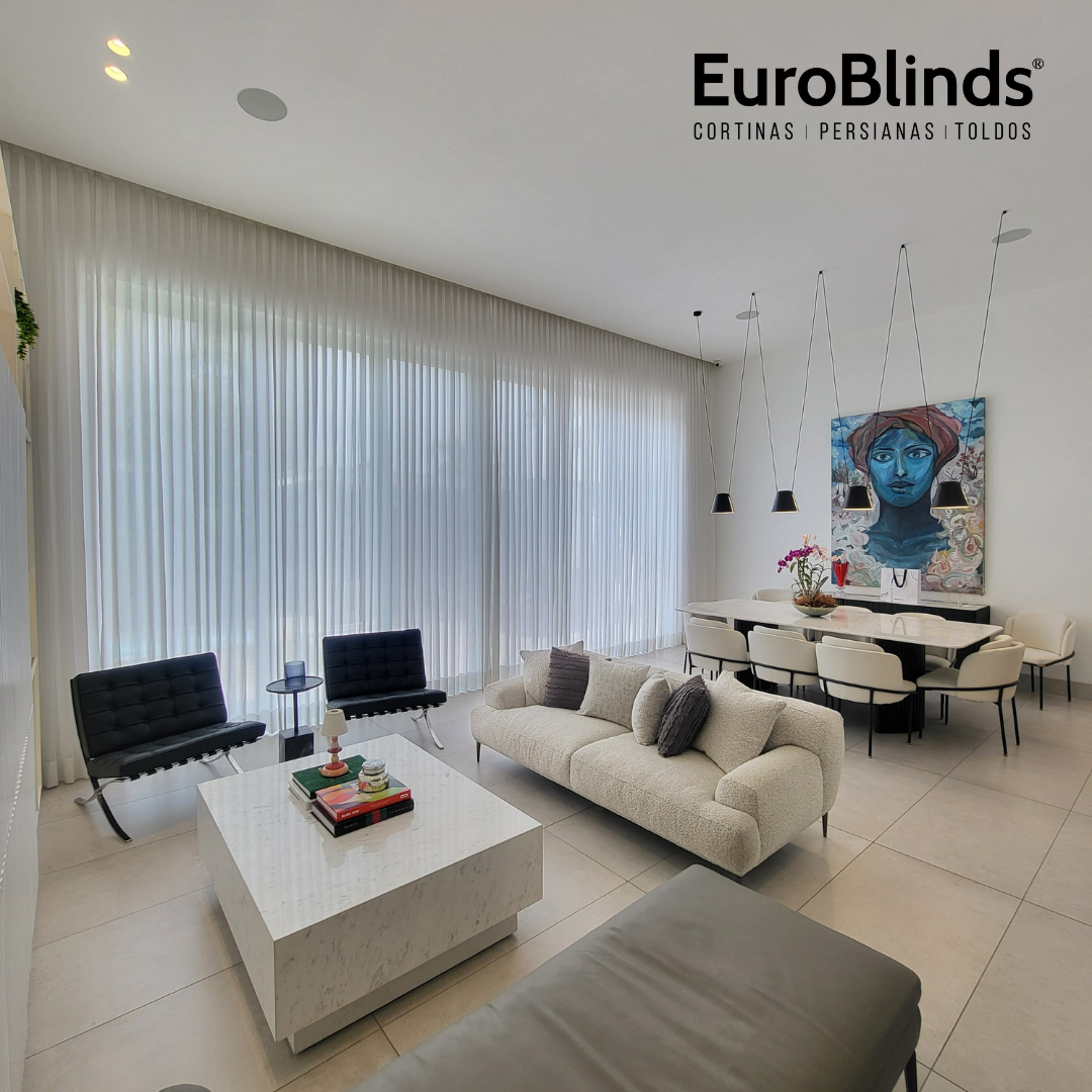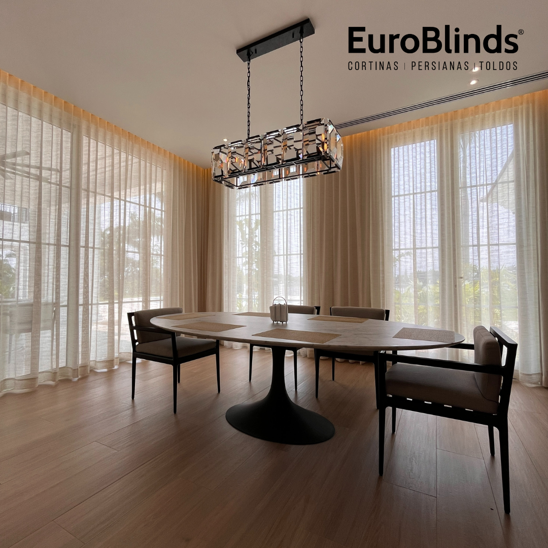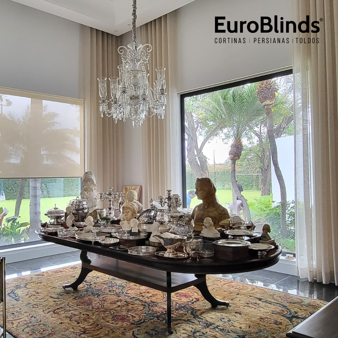 La cortina puede ser tanto manual como motorizada, y accionadana por medio de control remoto, comando de voz, celular o central inteligente.